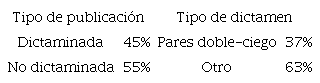 Un hallazgo de la muestra obtenida sugiere que la mayor parte de las revistas jurídicas en América Latina (55%) utilizan un medio distinto al dictamen como vía para seleccionar los materiales que publican. Un segundo hallazgo, mucho más sugerente e interesante, indica que dentro del universo de revistas analizadas que sí dictaminan los artículos que publican, 21% refiere a dictámenes que se realizan por pares externos (no ciegos) o por miembros de los propios comités editoriales. En ese sentido, de acuerdo con la información que se cuenta, se podría llegar a afirmar que el dictamen, particularmente el que es realizado por pares doble ciego, no es la principal práctica que predomina dentro del campo en análisis.