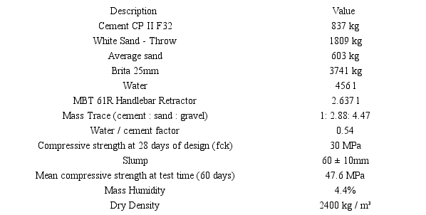 In the experimental program, 12 reinforced concrete beams with a length of 1.20 m and cross section of 0.12 mx0.20m, representing the base and the height respectively, were tested. The compressive strength of the concrete after 60 days is fc = 47.6 MPa and was determined, by arithmetic mean, through 4 cylindrical specimens measuring 0.10 m x 0.20 m.