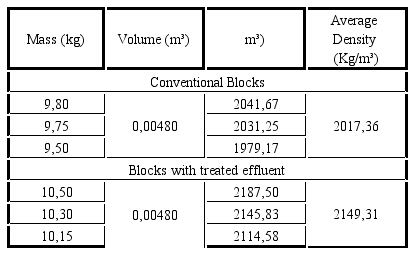 The effluent blocks showed greater compacity (particle packaging) and greater resistance. In Table 13, it can be verified that the sample of blocks with treated effluent showed greater density than the blocks of the other sample.