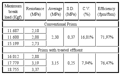 For axial compression resistance test, 6 blocks of each sample (conventional and treated effluent) were used at 14 and 28 days old, in a total of 24 packs. The results are presented in Table 10 and show a comparison between the average resistance of the samples.