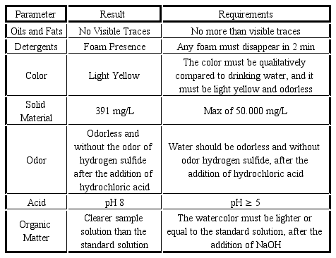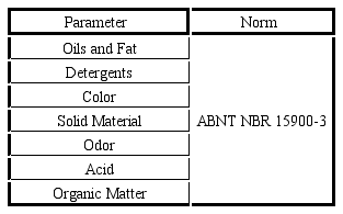 After collecting the effluent, preliminary evaluation of the effluent was carried out in relation to the parameters: oils, fats, detergents, color, solid material, odor, acids and organic matter, according to the normative recommendations of NBR 15900-1:2009. In this evaluation, the tests were made from qualitative analyses, with the exception of the test of solid material whose present content was quantified in the sample. The obtained results are displayed in time Table 5.
