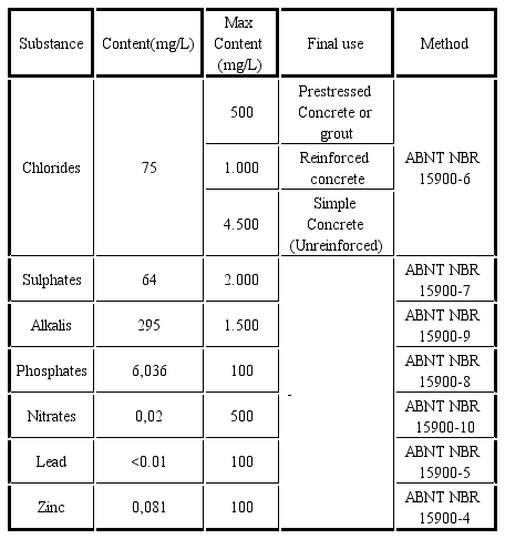 Chemically tested according to the standard recommendations presented in Table 6 in order to identify the presence of deleterious substances to the concrete, the content of chlorides, sulfates, alkali, phosphates, nitrates, lead, and zinc are quantified.