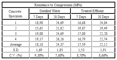 The average resistance to compression strength of the mortar test specimens with treated effluent at 7 and 28 days, reached more than 90% of the resistance to the average compression of the specimens prepared with distilled water, meeting the requirement of NBR 15900-1:2009. At 7 days it had a reach of 96.75%, and with 28 days the reach was 90.77%.