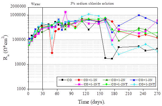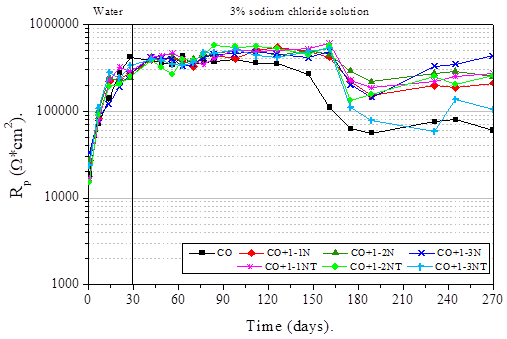 At the end of the test period all samples with Nopal, keep values greater than 1x105 Ω*cm2, with the exception of the CO+1-3NT sample, which maintained a slightly higher performance respect to the control sample. In contrast, the CO+1-3N sample reached values greater than 4x105 Ω*cm2 significantly improving the electrochemical properties of reinforced concrete. This response evidences part of the advantages offered by this Nopal gel, as it not only acts as a retarder of setting concrete, but also as an additive that can improve the electrochemical response of reinforcing steel, delay the onset and active spread of corrosion in reinforcing steel (Martinez-Molina et. al., 2015).