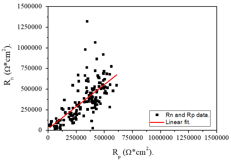 Some authors have analyzed the relationship between noise resistance (Rn) and polarization resistance (Rp), concluding that they can be considered equivalent for many systems (Aballe et. al., 2001; Girija et. al., 2007).