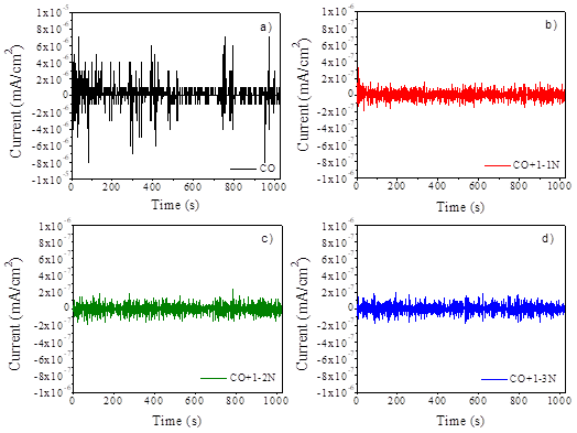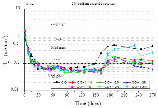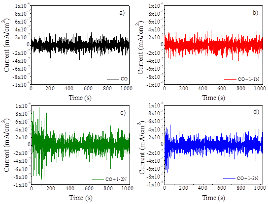 After 28 days of concrete curing, all current time series show a similar behavior with fluctuations that reach values of up to 2x10-7 mA/cm2. These low current values are indicative of a passivation state in the reinforcing steel. The passive layer of steel evolves over time (Hansson, 1984) and through this technique these small changes in current values can be detected (Gusmano et al., 1997; Cottis, 2001). Only CO+1-3N sample has some transients with values of up to 8x10-7 mA/cm2.