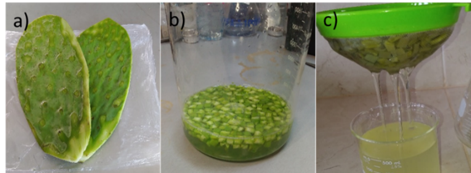 The cactus leaves that were used had a fresh state of preservation and were free of spines. To proceed with the extraction of the Nopal mucilage, the following procedure was carried out: i) the cleaning of the leaves was carried out to eliminate traces of dust and other residues, ii) the leaves were cut into pieces of 1cm x 1cm to extract the gel as much as possible and iii) the pieces were mixed with water to obtain three concentrations of mucilage in a Nopal-water weight ratio of 1: 1, 1: 2 and 1: 3, seen on Figure 1.
