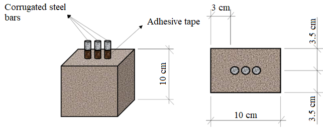 The specimens were designed with a 30 mm of concrete cover between the edge of the bars and the sides of the cube. Therefore, the specimens were 7 cm wide, 10 cm long and 10 cm high, and the exposed area of the steel bars in contact with the concrete was 18 cm2, as seen in Figure 2. Each steel bar was coated with adhesive tape on the mortar-air interface as described by other authors (González et. al., 2004; Caré and Raharinaivo, 2007; Poursaee, 2010).