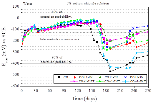 During the concrete curing process, it is clear that the potential of all samples acquires very noble values, between -90 and -50 mV. These values remain in the range of a 10% probability of corrosion (Pérez-Quiroz et. al., 2008). The high alkalinity, as well as the presence of moisture and oxygen in the concrete pore network, are factors that influence these potential values. Under these conditions, the steel develops an oxides passive layer of compact and warterproof (Hansson, 1984).