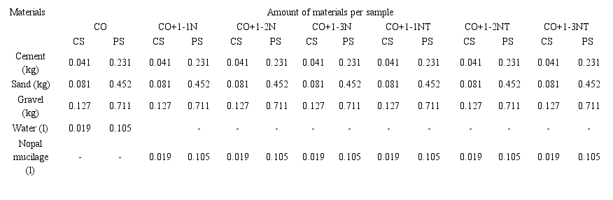 The extraction of the Nopal mucilage was carried out by two methods, which are described below. Maceration at room temperature, in which each Nopal mixture with water was allowed to macerate for 48 hours for later use in the concrete. After this time the solution began to acquire a darker tone and a certain smell of decomposition, as other authors affirm (Chandra et. al., 1998). The following extraction method was maceration applying temperature in this case the Nopal and water mixtures were placed on a grill applying a temperature of 95 degrees Celsius for 10 minutes. Then it was allowed to standstill for 24 hours, at which time the solution was incorporated into the concrete. In both extraction methods before incorporating the Nopal mucilage into the concrete the solution was filtered.