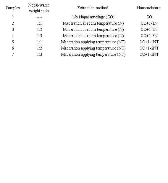 Table 2 shows the nomenclature used to identify each sample with the different concentrations of Nopal mucilage, as well as the control sample.