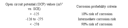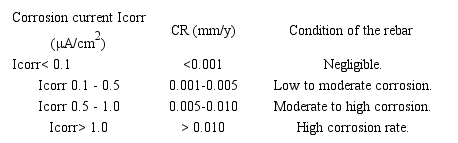 The ranges of corrosion rate values in terms of the useful life of reinforcing steel in concrete are shown in Table 4 (Andrade and Alonso, 1996).
