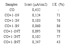 where: I.E. is the efficiency of the inhibitor, Icorr is the corrosion current density (μA/cm2) without inhibitor and I´corr is the corrosion current density (μA/cm2) with inhibitor.
