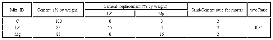 Three mix designs were evaluated. For each mix design, cement paste, and mortar were prepared. The details of the mixtures are presented in Table 2 for cement paste and mortar mixes. LF and Mg were used to replace 15% by weight of the cement. The water-to-cement ratio (w/c) was kept constant in the paste, mortar and concrete at 0.34. LF and Mg were not considered as cementing materials in the w/c ratio calculation. This was done in accordance with the Canadian Standards Association CSA A23.1-14. The use of 0.34 w/c ratio was to represent a typically used w/c in self-consolidating concrete (Esmaeilkhanian et al. 2014, Celik et al. 2015). No HRWR was used in cement pastes to prevent any variation in the heat of hydration or thermal analysis results. The sand-to-cement ratio in the mortar mixtures was 2.