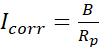(4)From the Stern-Geary equation (5), corrosion current density was related icorr, with the Rp, through a constant of proportionality B (Román et. al., 2016). Constant B can acquire the values of 0.026 V to 0.052 V, depending on the type of system analyzed (Sagües, 1991).