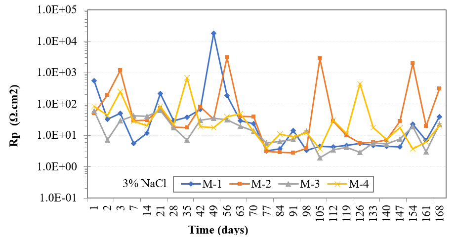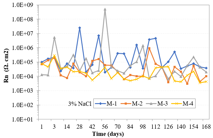 The average of the resistance oscillations of the electrochemical noise is presented in Figure 6. At the start of the measurement all samples presented low Rn values between 1x104 Ω.cm2 and 1x105 Ω.cm2; during days 28 and 70. Sample M1 and M3 presented high and low fluctuations of Rn, possibly due to the formation of protective oxide films, holding the metal passive. At the end of day 168 of exposure to the saline medium, all samples maintained low noise resistance values around 1x104 Ω.cm2.