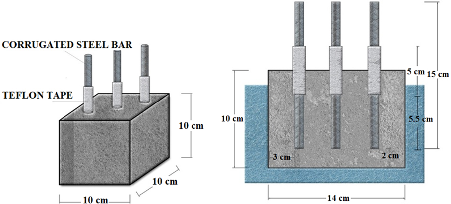 The preparation of concrete samples was done according to (ASTM C-31, 2019). For electrochemical tests 3 cubic specimens 10 cm per side were made from the same mix design, as shown in Figure 1. Three corrugated rods were embedded in each cubic specimen, of dimensions 0.95 mm in diameter. The length of the embedded rod was 5.5 cm. At the interface between the paste and the atmospheric environment, the rod was covered with approximately 5 cm long with teflon tape around the rod.