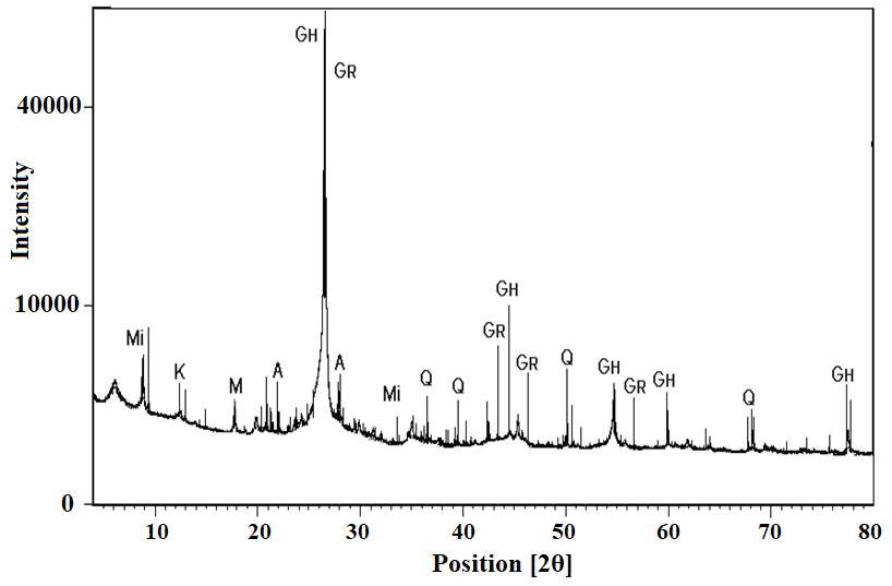 The 2H structure, is the most common form in the phases identified with 39.9% values and the 3R with 27.4% values, with a total addition of 67.3% in carbon content. The sample contains 32.6% of clay components as: quartz, smectic phyllosilicates, kaolinite, mica.