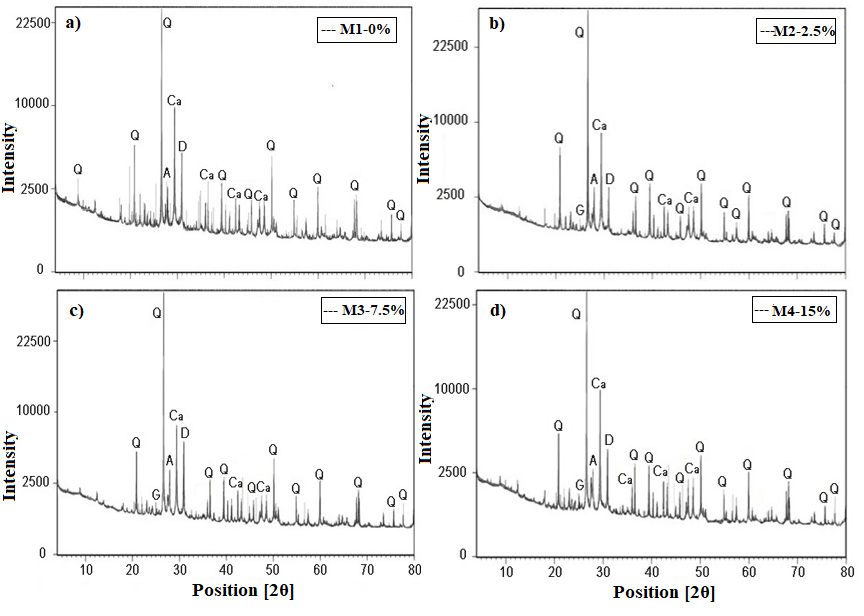 Figure 3a shows the crystalline phases of hydration of concrete: high peaks of quartz (Q) and calcite (Ca) were observed; in addition to dolomite (D) and plagioclase or Andesine (A). The main abundant elements that appear in the control sample are Q y Ca, due to the main presence of limestone in the cement.