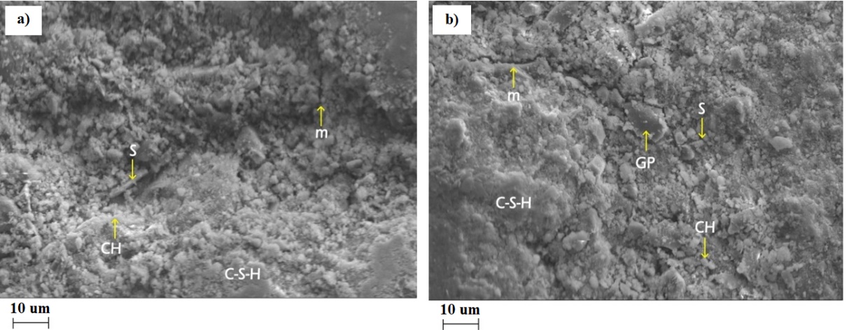 The SEM micrographs of the concrete are presented in Figure 4, the visual analysis of Figure 4a belongs to the control sample M1, microcracks (m) can be seen in the paste matrix, as a result of the compressive resistance and sample extraction technique. Together calcium silicates hydrated were observed (CSH), and greater presence of portlandite (CH) and etringite (S). For the visual analysis of the S crystals they are elongated shapes, generally in fibrous habitats or in the form of long rods. CH normally occurs as thin hexagonal platelets, often tenths of a micrometer wide (Vetter et. al., 2019).