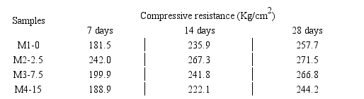 Table 7 shows the average values of compressive resistance (F´c) after 7, 14 and 28 days of curing. The control sample M1-0, was designed for a theoretical resistance of 250 kg/cm2, during the 28 days of curing. It acquired an average maximum experimental resistance of 258 kg/cm2, exceeding the theoretical design value. Sample M2 with 2.5% GP, an increase in compressive resistance is observed at early ages of 7 days with a value of 242 kg/cm2. During the 28 days of curing the compressive resistance increased by 4.6% compared to the strength of the control sample. Sample M3 with 7.5% GP, during the days of curing a constant increase of f´c is observed reaching a final resistance to compression of 267 kg/cm2; sample M4 with 15% GP shows a low f´c with a value of 244 kg/cm2, due to the increased amount of water added.