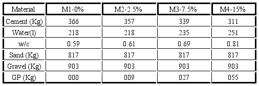 In compressive resistance test, the sample M2 with 2.5% GP content, presented a high value in the mechanical properties of concrete with respect to the control sample but the percentage of porosity in the concrete paste decreased; this fact may be due to the absorption of water by the GP particles in the concrete matrix.