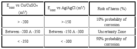 Table 3 presents the conversion of the corrosion half-cell potentials used to the saturated copper / copper sulfate reference electrode by adding +50 mV (Berkeley et. al., 1990; Chess et. al., 1998).