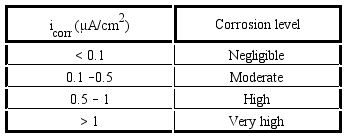 According to the ranges of values (Rincón and DURAR et. al., 1997), the service life of reinforced concrete can be determined from the current density (icorr), with the data established in Table 5.
