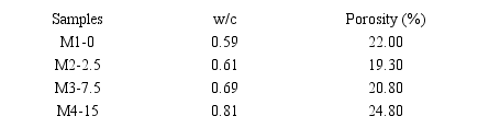 Table 6 shows the percentage values of concrete porosity. As it can be seen, by adding graphite content in 2.5% by weight of cement, the mixture acquires a higher water absorption and affects the water/cement ratio compared to the control sample. Sample M1 has a porosity percentage of 22% with w/c ratio of 0.59, the results show that in the M2 design with 2.5% GP the porosity of the concrete decreases with respect to the sample M1; the samples M3 and M4 register a greater increase in the w/c ratio due to the increase in the amount of water added with values of 0.61 and 0.81.