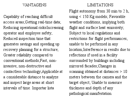 Table 3 shows that main advantages of using this technology are linked to optimizing inspection procedures, obtaining data in real time and in a shorter interval of time. On the other hand, limitations are related to requirements to obtain an accurate thermogram, considering favorable climatic conditions and readings made from angles and distances unable to interfere with the results.