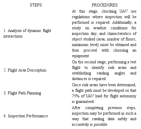 By analyzing Table 4, it is verifiable that an initial stage is related to previous requirements for the inspection using a thermographic camera integrated with an UAV, including verifying any regulation for such equipment where the procedure will be performed, weather conditions, being necessary winds of less than 7 m/s and not during cloudy days, having knowledge of the object to be studied, such as dimensions and location, and finally choosing an equipment that guarantees a flight autonomy for such procedure. Afterwards, inspection area where the UAV will be moving along the inspection must be determined, paying attention to risk areas such as places where people, animals and obstacles are present, and establishing angles and distances where readings will be taken, at distances ˂ 10 meters and at angles according to Section 3.1, ensuring the accuracy of the data obtained. From there, a path to be traveled by the UAV must be planned in such a way that risk area displacement is avoided and the device has sufficient flying autonomy to finish a flight with 75% of charge in the battery, including energy consumed during landing and take-off procedures. Finally, once previous steps have been completed, the inspection may be performed.