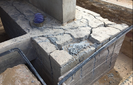 In the various treatments studied it was necessary to use materials that had a high mechanical resistance to compression, traction, and shear, and epoxy resin was one of the materials recommended for the treatment of cracks and fissures affected by ASR. Because it is a rigid material after curing, it is important to restrict its use to passive fissures and cracks, i.e., those that present no movement, as was the case with the foundations cited in this study.