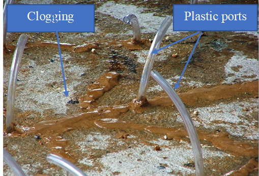 In the injection process, plastic and metallic ports were used, as shown in Figures 10 and 11. The metallic ports are part of the new advances in the injection process, to which an injection can be applied under higher pressure, and consequently the penetration of the material to areas of greater depths can occur in a shorter span of time. However, from the data collected in this study, filling was done to close external cracks and ensure the injection, and the most used materials were plastic ports, which are simpler and easier to find on the market.
