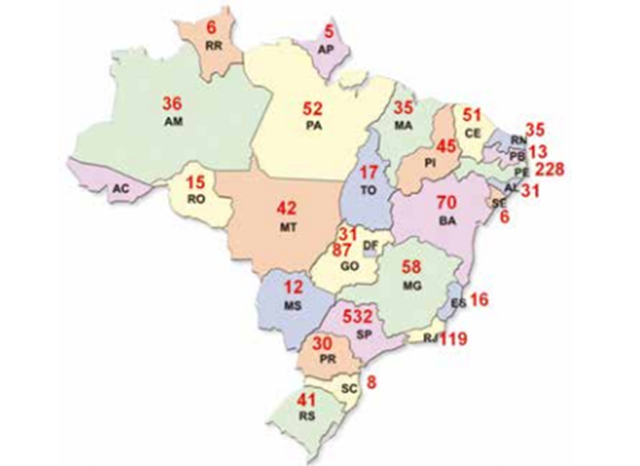 According to Battagin (2016), through IBRACON’s dissemination work and the standardization of the number of tests performed at the ABCP laboratories, in the absence of statistics from other laboratories, it was found that the number of tests sent to ABCP has increased considerably throughout the country, in many construction-related areas. Aggregate samples have been sent by a diverse group, including aggregate suppliers (quarries), concrete service companies, construction companies, designers, universities, and even other laboratories, showing that the entire construction supply chain has gradually become aware of the importance of preventing pathological manifestations related to AAR. The profile of clients requesting tests and their geographic origin was determined, based on 1621 fine and coarse aggregate samples received by the ABCP laboratories, which had sufficient information, as shown in Figure 1. Most requests come from São Paulo (532 samples) and Pernambuco (228 samples), with requests being recorded from all Brazilian states except for Acre. (Battagin, 2016).