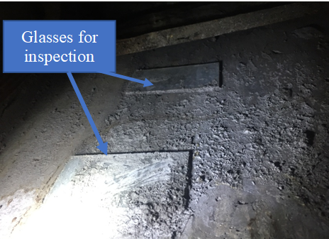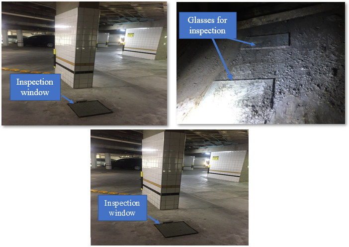 As a result, it was found that, of the 50 foundations surveyed, only two left the inspection windows. The windows are small openings left in the foundation elements that make it possible to monitor the recoveries from the floors above, as shown in Figure 14. Internally, small pieces of glass are placed, shown in Figure 15, where cracks had previously been identified, so that they can be periodically monitored after their recovery. If any new movement of the foundation block occurs, the tendency will be for this glass to break, indicating a possible continuing of the ASR, or of some other pathological manifestation.