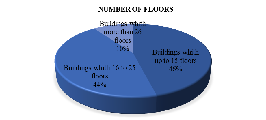 Figure 4 shows the percentage of buildings based on their floor count, divided into categories having 15 floors or fewer, 16 to 25 floors, and more than 25 floors (with the tallest building having 41 floors) for a total of 50 catalogued buildings.