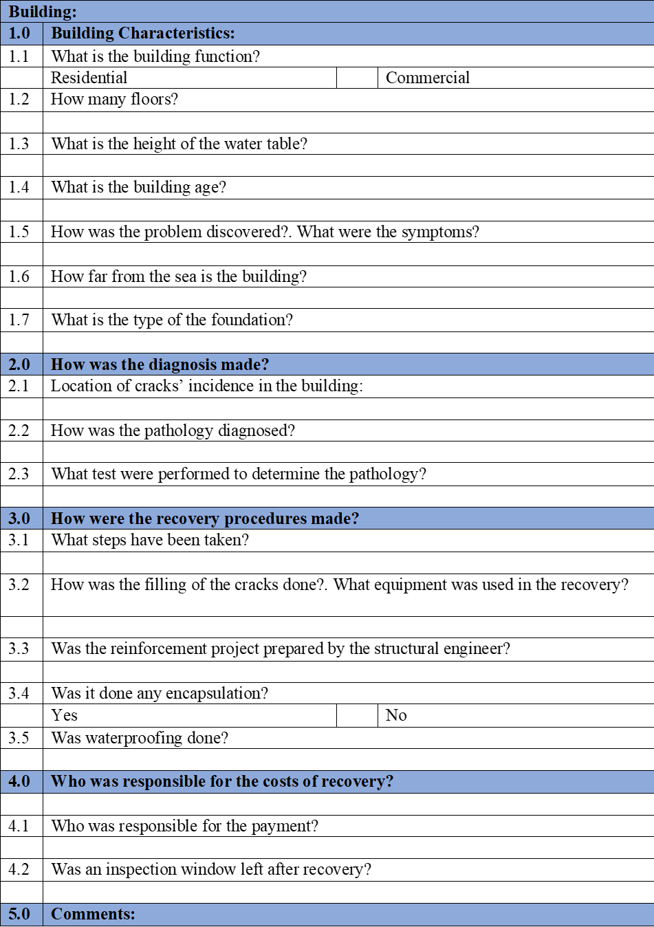 The third step was the application of a questionnaire containing fifteen questions about commercial and residential buildings where the ASR pathology was proven and recovered. During application of the questionnaire, shown in Table 2, information was sought about the pathological manifestation, a history of the project’s characteristics, how the diagnosis was determined, the recovery process, and its costs.