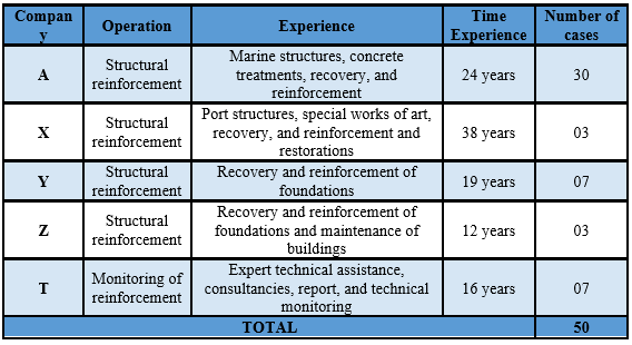 The companies that participated in this universe of information were very receptive and provided all the necessary elements, with the understanding that the identities of the buildings listed and of the companies themselves would remain confidential. Thus, each company was referred to by a random letter, not associated with its name. Table 2 provides a general survey of the companies consulted, showing their activities and the total number of foundations detected.