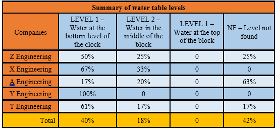 After all the analyses at the company level, Table 4 was created to summarize the water table results and address their relationship with the 50 foundations in a general way. Forty percent of the foundations had water at the bottom level of the block (level 1); 18% had water in the middle of the block (level 2); while no foundations were identified with water at the top of the block (level 3). Water table information was not found for 42% of the foundations surveyed.