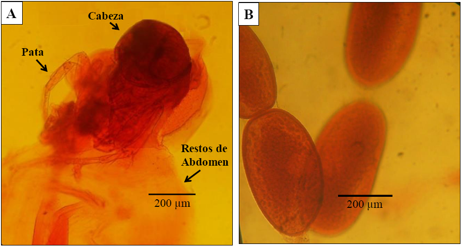 En la Figura 1 se muestra un ejemplar y huevos de T. penetrans extraídos de un habitante de Cañifle parasitado, donde se pueden observar algunas de las partes del parásito, entre ellas: cabeza, patas y restos del abdomen.