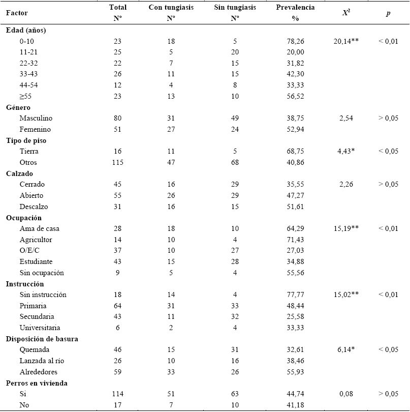 Muchos de los factores arriba mencionados resultaron significativamente asociados al porcentaje de infestación por tungiasis (Tabla 1) en la población estudiada como se muestra a continuación: