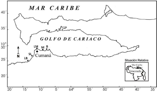 El estudio se realizó en la zona suroccidental del Golfo de Cariaco, realizándose muestreos bimensuales desde mayo de 2004 hasta marzo de 2005 en cinco estaciones con sustrato arenoso y areno-fangoso. Las mismas fueron denominadas: Los Bordones (LB) (10°32’N; 64°11’O), San Luis (SL) (10°26’N; 64°11’O), La Marina (LM) (10°128’N; 64°11’O), El Monumento (M) (10°28’N; 64°11’O), y Los Boqueticos (B) (10°28’N; 64°7’O) (Fig. 1).
