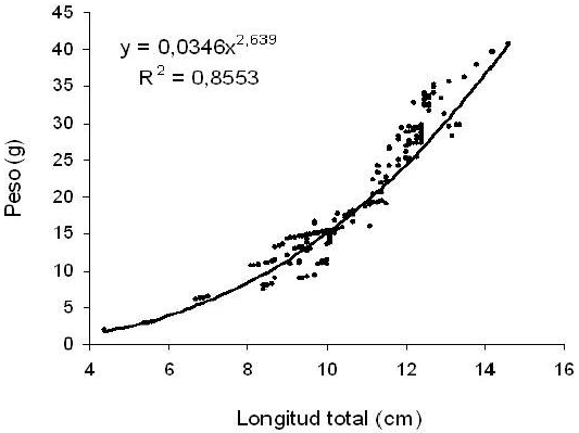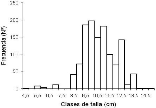Las frecuencias de talla de la población fue polimodal (Fig. 2) con tallas que oscilaron entre 4,4 y 14,6 cm de Lt, y escasos individuos entre 4 y 7,5 cm, estando el 91,95 % de los organismos comprendidos entre 8 y 12 cm de Lt, constituyendo el grupo mayoritario de la población.