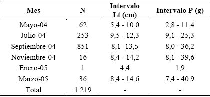 Se capturaron 1.219 ejemplares en la zona de muestreo, que se puede considerar un área inestable por estar constituida preferentemente por ser fondos arenosos muy dinámicos debido al movimiento de las olas y la cercanía a las costas. La talla de los ejemplares capturados osciló entre 8,02 cm y 19,8 cm de Lt, con promedio de peso de 9,08 g, siendo septiembre el mes donde se capturó el mayor número de ejemplares (Tabla 1).