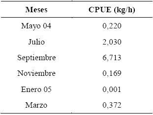 La variación mensual de la captura por unidad de esfuerza (CPUE) indica que las mayores abundancias se obtuvieron en julio (2,03 kg/h) y septiembre (6,713 kg/h), y la mínima en enero (0,0008 kg/h) (Tabla 2). Este parámetro además de reflejar de forma directa los resultados de los muestreos, permite conocer la situación de la población y las variaciones mensuales que experimentan las capturas. Los máximos valores de abundancia registrados en julio y septiembre podrían estar relacionados con el período de lluvias que incrementan el aporte de materia orgánica, aumentando la productividad del área y la probabilidad de obtener alimento.
