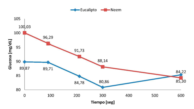 La concentracion de glucosa presentó tendencia a disminuir a través del tiempo (Fig. 1), la reducción fue más marcada y estable para la planta A. indica, lo cual indicó que el efecto hipoglucemiante fue mayor que el de E. camaldulensis, asimismo, la concentración de glucosa fue estadísticamente igual en los primeros instantes del ensayo, pero presentó una reducción significativa a partir de los 210 segundos del ensayo (Tabla 2).