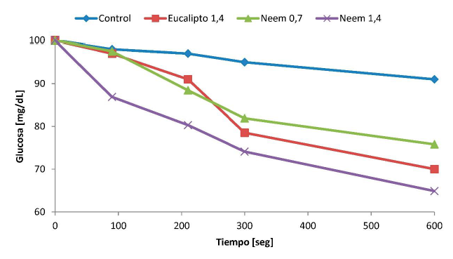 La solución acuosa de A. indica para las dosis de 0,7 y 1,4 g/dL, provocó disminución significativa en los niveles de glucosa a partir de los cinco minutos de reacción, presentando un porcentaje de consumo de 15,4% hasta 26,6%; sin embargo, esta misma solución en dosis de 0,01 y 0,05, 0,175 y 0,5 g/dL no evidenció consumo de glucosa, este mismo comportamiento se observó para la solución acuosa de E. camaldulensis en las dosis de 0,01 y 0,05, 0,175 y 0,5 g/dL, asimismo, las dosis de 0,7 y 1,4 g/dL provocaron un consumo estadísticamente no significativo de glucosa, por lo cual se puede inferir que aun cuando el consumo de glucosa tiende a aumentar a través del tiempo, la reducción es más marcada y estable para A. indica, en comparación con el comportamiento errático del consumo de glucosa mostrado por la solución de E. camaldulensis.
