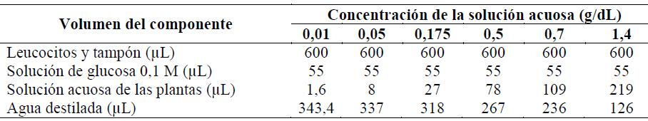 Se incubaron las muestras de 106 leucocitos a 37°C, durante un tiempo comprendido entre 0 y 10 minutos en 600 µL de un medio iónico apropiado (Hepes-KOH 20 mM pH 7,5, tampón fosfato 5 mM, pH 7,5; KCl 2,5 mM, NaCl 70 mM y Mg2SO4 2,5 mM), bajo condiciones normoglucémicas, lo cual se obtuvo agregando 55 µL de solución de glucosa 0,1 M, equivalente a 99 mg/dL para un volumen final de 1 mL. Adicionalmente, se agregó insulina Humulin® en concentraciones de 0,1; 1 y 10 nM para los controles, y para los tratamientos, las soluciones acuosas de las plantas A. indica y E. camaldulensis en concentraciones de 0,01; 0,05; 0,175; 0,5; 0,7 y 1,4 g/dL, para lo cual se agregaron 1,6; 8; 27; 78; 109 y 219 µL de la solución madre al 6,4% m/v, respectivamente, los volúmenes faltantes para alcanzar 1 mL se completaron con agua destilada (Tabla 1)