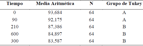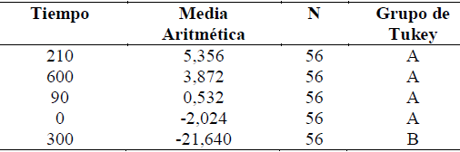 La prueba de medias de Tukey mostró que en general, la reducción en la concentración de glucosa tiende a ser mayor a través del tiempo, con la notable excepción a los 300 segundos, la cual presentó un comportamiento anómalo debido a un valor inusualmente elevado con signo negativo para la planta E. camaldulensis (Tabla 5).