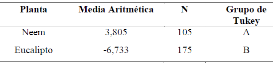 La prueba de medias de Tukey para la planta utilizada mostró que hubo una reducción mayor para la solución acuosa de la planta de A. indica, lo cual evidencia su mayor efecto hipoglicemiante, el valor negativo para E. camaldulensis indica que en la solución acuosa se midieron concentraciones de glucosa mayores a las del control (Tabla 3).